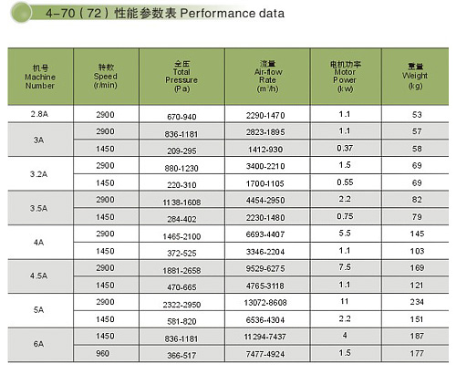4-79、4-70(72)型離心風機是引進日本ミツヤ公司的先進技術并通過本公司工程技術中心進行吸收、消化、創新研制而成,其性能指標優于我國通用的4-79、4-72型離心通風機。該風機噪聲較老式風機低5~8dB(A),外形尺寸也較老式風機緊湊,效率及比A聲級優于機械工業部制訂的標準。4-70型通風機共15種機號,風量930~154000m3/h,風壓170~2950Pa;4-79型通風機共20種機號,風量1100~438000 m3/h,風壓230~3320Pa,用戶可根據不同參數選擇。